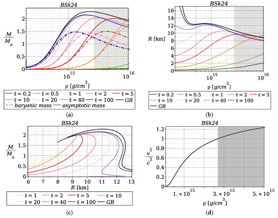 One more restriction for possible models of neutron stars comes from the model equations of state that are used for describing the inner structures of stars. The point is that the speed of sound, , could become larger than the speed of light for some values of density . This provides restrictions for possible values of , since it is obvious that the models with contradict the principle of causality. In Figure 3d, we show the dependence of on for the BSk24 equation of state. One can see that there is a domain such that (highlighted in gray). (Note that the causality limits for the BSk22-26 equations of states were discussed in [77].) The same domain in gray is shown in Figure 3a,b, and one can see that the configurations with small values of the non-minimal coupling parameter are non-physical. For example, let us discuss the graph with in Figure 3a. Its part corresponding to is located at densities significantly exceeding the permissible range of central densities. On the other hand, the permissible range of central densities corresponds to masses significantly smaller than . Thus, the case encompassing small values of the non-minimal coupling parameter ℓ takes us away from the applicability area of the equation of state or observable range of neutron star masses. For this reason, we will consider only the relatively large values of the non-minimal coupling parameter .
