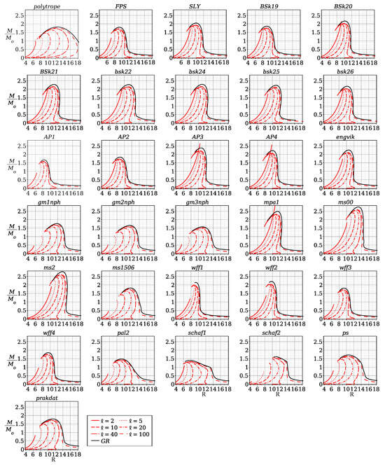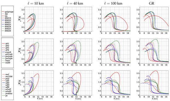 In Figure 5, the mass/radius diagrams are presented in the case and ℓ = 2, 5, 10, 20, 40, and 100 km for different equations of state. The black curves correspond to the unmodified theory of gravity (GR). The red curves of different styles correspond to different values of ℓ. Finally, the diagrams for all equations of state are given in Figure 6.