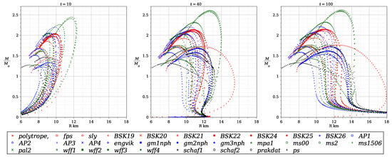 In Figure 4, 31 equations of state were divided into three subgroups for convenience. The top row of the pictures corresponds to the polytrope, FPS, SLY, BSk19–21, BSk22, and BSk24–26 equations of state; the central row corresponds to AP1-4 engvik, gm1nph, gm2nph, gm3nph, mpa1, and ms00; and the bottom row corresponds to ms2, ms1506, pal2, wff1, wff2, wff3, wff4, schaf1, schaf2, prakdat, and ps. The left column of pictures in Figure 4 corresponds to km, the middle column corresponds to km, and the right column corresponds to km. The correspondence between the equation of state and the curve style is indicated on the left.