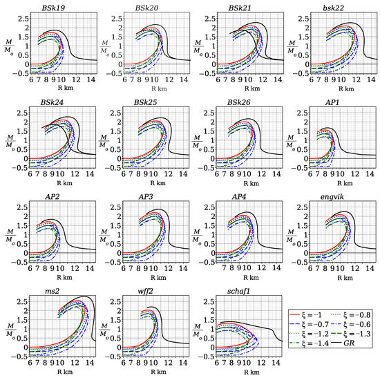 Here, we would like to stress that all theoretical results obtained by us above must, of course, be compared with known observable data. More recent analysis tells us that the reliably measured maximum mass of a neutron star is 2 (see ref. [16]). The constraints for the measured radii of neutron stars are not so strict. There is currently a consensus that their radii are within 10–14 km (see [16] and also [14]). Therefore, we should critically analyze the set of mass/radius diagrams obtained for different model parameters and equations of state, and exclude some of them from consideration due to being non-physical. For example, models that do not allow diagrams with masses greater than 2 contradict observations and should be rejected. In particular, based on Figure 5, we can conclude that the models with equations of state SLy, BSk20–22, BSk24–26, AP3, AP4, engvik, mpa1, ms00, ms2, wff1, and wff2 are surviving. Moreover, we have already noticed that the models with small values of the non-minimal coupling parameter correspond to the radii R of neutron stars of less than 10 km and hence also contradict observations.