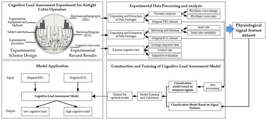 This section presents an experimental study collecting physiological signals from operators in airtight cabins. It outlines the experimental design and data-processing methods employed in this research and introduces a cognitive load assessment approach based on a 1D-CNN. The overall framework of this study is shown in Figure 1, including the cognitive load assessment experiment for airtight cabin operators, experimental data processing and analysis, the construction and training of the cognitive load assessment model, and the model application.