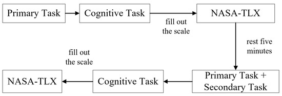 The experimental flow is depicted in Figure 2. In the first experiment, subjects were initially asked to complete a primary task. After completing the primary task, their cognitive abilities, such as memory, reaction time, and attention, were assessed using E-prime 3.0 software. Lastly, they filled out the NASA-TLX subjective rating scale to subjectively evaluate the primary task.