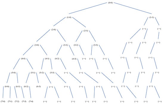 The sampling frequency of the EEG signal in this study is 512 Hz, and the MATLAB program algorithm reduces the sampling frequency to 200 Hz to make the spectral features of the four decomposed rhythmic waves more obvious. We designed a wavelet packet 7-layer decomposition tree, as shown in Figure 4, and used daubechies4 wavelet basis functions for decomposition reconstruction. The frequency resolution of each layer can be expressed as Equation (4), and the frequency resolution of the 7th layer is calculated as 0.78 Hz after downsampling.