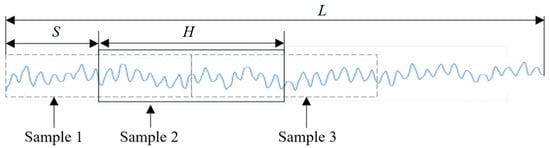 Based on the frequency relationship between EEG signals and ECG signals, EEG signal data with a fixed length of 400 and EEG signal data with a fixed length of 3 were extracted. EEG and ECG signals were concatenated along the channel dimension, forming a single 1D input vector with a length of 403 (200 Hz). This combined input preserves temporal synchronization between signals. Data expansion was achieved by using a sliding window sample interception method. This method can expand the training data by dividing it into a series of short subsequences, allowing machine learning algorithms to learn and predict separately on each subsequence, thereby improving the performance of the model [6,7]. The sliding window slides over the input physiological signal in certain steps and extracts the physiological signal into multiple samples of equal length to the window. The schematic diagram is shown in Figure 6. Assuming that the length of the original physiological signal is L, the length of the sliding window is H, and the step size is S, the number of samples, M, obtained after this segment of the signal is divided and can be expressed by the following equation:
