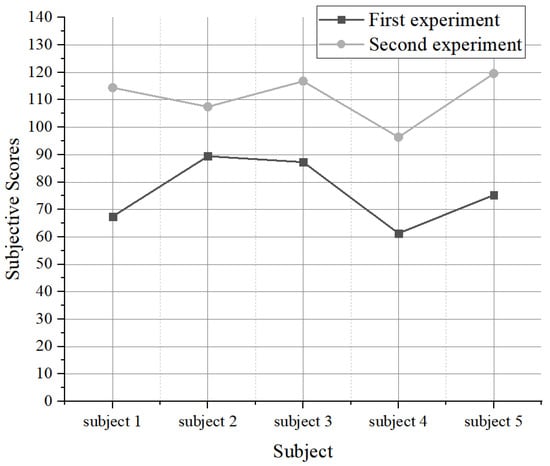 At the end of the experiment, the subjects filled out the NASA-TLX subjective scale and scored six indicators, each with a score of 0 to 100, with higher scores representing a corresponding higher cognitive workload. In addition, the subjects were asked to rank the weighting of the six indicators, assigning different weighting values (1, 2, 3, 4, 5, and 6). Finally, a weighted average based on the scores and weights of the six indicators was used to obtain the comprehensive subjective evaluation value.