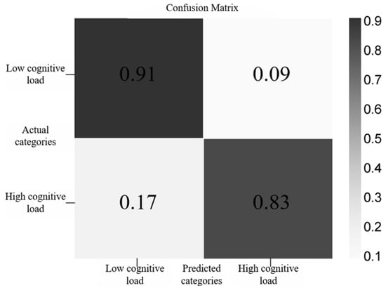 With advances in artificial intelligence technology, evaluating cognitive load using algorithms such as support vector machines (SVMs), multilayer perceptrons, K-nearest neighbors, and convolutional neural networks (CNNs) has become a popular research direction. Hemakom et al. proposed a multimodal machine learning framework that integrated EEG and electrocardiogram (ECG) biomarkers and incorporated six classifiers (multilayer perceptron, AdaBoost, K-nearest neighbors, logistic regression, naive Bayes, and SVM) to achieve 76.55% classification accuracy across cognitive load gradations [13]. Tjolleng et al. constructed an artificial neural network using feedforward networks and scaled conjugate gradients as backpropagation learning rules to classify drivers’ cognitive loads based on ECG data [14]. Tabar et al. used time–frequency transformations of EEG data based on convolutional neural networks to evaluate mental workload [15]. Jiao et al. proposed an improved convolutional neural network to classify cognitive load, not only reducing the number of parameters required for model training but also enhancing classification performance. These studies demonstrate the superiority of convolutional neural networks and classifier algorithms in assessing cognitive load.