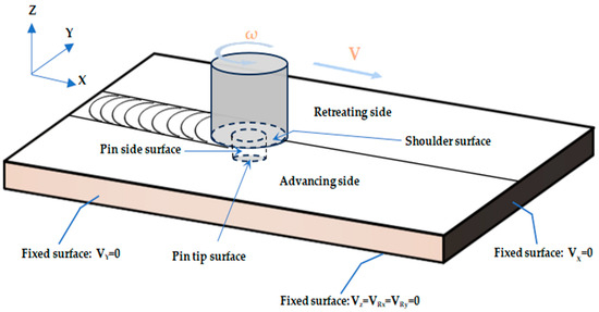 When a temperature gradient exists between two or more bodies, or within a single body, heat is transferred through molecular and atomic collisions. Consequently, the temperature field’s formation is influenced by the surrounding environment in addition to the workpiece’s properties during welding. The distribution of the temperature field is significantly predicted by the definition of thermal boundary conditions in numerical simulations. The efficacy of heat transfer between the workpiece surface and adjacent media is determined by boundary heat transfer conditions, as the thermal response of the material during welding is influenced by both internal heat sources and the heat exchange with the external environment. Different thermal boundary environments may result in significant changes in temperature gradients, cooling rates, and the associated thermal stress behavior. For instance, Khalaf et al. [44] compared the differences in heat conduction and residual stress evolution between conventional FSW in air and underwater FSW (UFSW) through experimental measurements and CFD simulations. They found that when water is used as the cooling medium, heat dissipates more rapidly in the weld zone, resulting in a lower peak temperature and a reduction in residual stress levels. This phenomenon suggests that the temperature field and the resulting stress state can be substantially influenced by a simple modification to the boundary heat exchange environment, even under identical heat input conditions. The heat exchange boundary conditions between the workpiece and the surrounding environment must be considered in order to accurately describe this process. The primary thermal exchanges during welding occur between the upper surface of the workpiece and the air, as well as between the lower surface and the supporting plate.