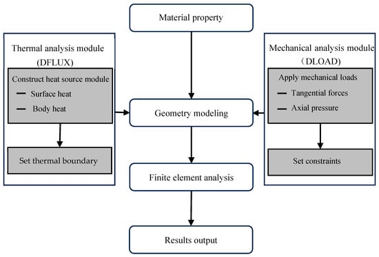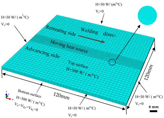 Numerical simulations were performed utilizing the ABAQUS 2021 software platform to further examine the distribution of the temperature field and the development of residual stress in the friction stir welding process. As shown in Figure 2, this model fully accounts for the thermomechanical interaction mechanisms during welding, with user subroutines DFULX and DLOAD employed to accurately apply the heat source and mechanical loads, thereby enhancing the physical realism and predictive accuracy of the simulation.