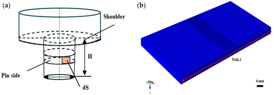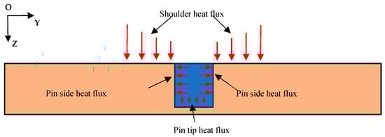 Previous studies have indicated that the primary sources of heat generation in the FSW process are the friction between the stirring tool and the workpiece, as well as the material’s plastic deformation during welding [31,32,33]. According to research, the total heat output in FSW may be divided into two parts, as illustrated in Figure 4: the heat generated by plastic deformation in the weld zone and the heat generated by frictional contact between the tool and the workpiece. Frictional heat generated at the tool–workpiece contact is the main source of heat creation during FSW [42]. According to pertinent research, plastic deformation often contributes just a small portion of the overall heat input, whereas frictional heat typically makes up the bulk. As a result, this study uses a heat source model where frictional heat predominates.
