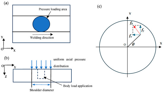 During the simulation of the moving heat source in FSW, a thermo-mechanical coupling mechanism is introduced. The model accounts for mechanical loads exerted by the stirrer on the material throughout the welding process. These loads include a surface force applied to the shoulder, a body force induced by the downward pressure on the shoulder, and another body force generated by the stirring pin. The shoulder surface load simulates the external vertical pressure acting on the stirrer during welding, mainly applied to the contact interface to reflect the actual stress state. In order to simulate shear forces brought on by rotating friction, the body load is applied to both the shoulder and pin areas. This captures the intricate relationship between the tool and the material as well as its mechanical reaction. As shown in Figure 5, the mechanical pressure and frictional shear force distributions are incorporated in the model. The working torque is simplified as shear stress along the tool–material interface, while the axial force is characterized as a homogeneous surface pressure. The vertical distribution pressure is denoted as follows [37]: