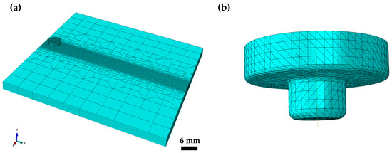 The stirring tool used in welding has the following geometrical specifications: a shoulder diameter of 10 mm, a pin diameter of 4 mm, and a pin length of 2.7 mm. Furthermore, two sets of parameters for the welding process were created for comparison. The first set included welding speeds of 80 mm/min, 100 mm/min, and 120 mm/min while maintaining a constant tool rotation speed of 1300 r/min. The second set varied the rotation speed to 900 r/min, 1100 r/min, and 1300 r/min while fixing the welding speed at 100 mm/min. Previous studies on friction stir welding [41] have indicated that overly coarse meshes may reduce computational accuracy, whereas excessively fine meshes can significantly increase computational time. In this study, a transitional mesh is used to ensure efficiency and computational accuracy, accelerating the thermomechanical coupling calculation process. In the mesh transition area, a mesh size of 0.15 mm × 0.1 mm is used, and in the welded region, a mesh size of 0.1 mm × 0.1 mm is used, as shown in Figure 3. The thickness direction is divided into three layers of elements, with a total of 9360 elements. In the finite element model, the thermomechanical coupling is handled using a fully coupled approach. The mesh is divided into hexahedral elements, with the element type selected as C3D8RT.