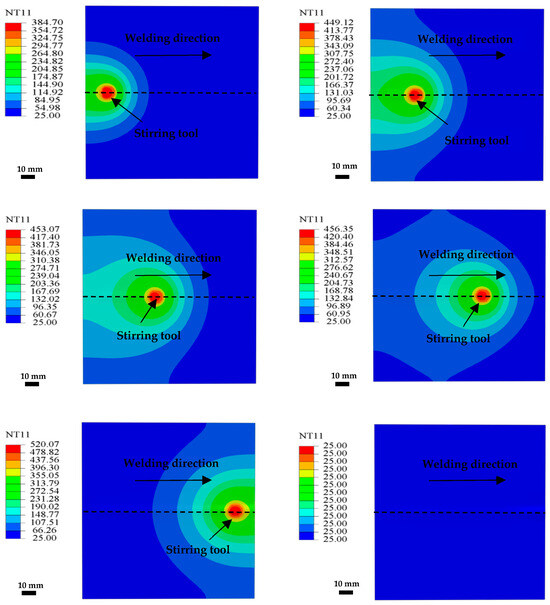 In this section, a fully coupled thermal–mechanical analysis is conducted. During welding, both the temperature field and the mechanical loading from the stirring head are applied simultaneously. Heat flux is introduced into the finite element model using a moving heat source formulation (see Formulas (4) and (5)), while the axial force and tangential load are implemented according to Formulas (12)–(14). Predictions are made for temperature and stress distributions throughout the aluminum alloy welding process. Figure 8 illustrates the temperature profile on the welded plate surface during various stages—heat source movement, steady welding, and cooling. The simulation shows that the temperature field across the weld exhibits a symmetric pattern. However, the backside of the shoulder heat source reaches a higher temperature than the front. This is because, as the heat source progresses, the rear side remains exposed to heat for a longer duration, whereas the front side experiences a shorter thermal contact period. As a result, insufficient conduction time to the front limits heat transfer, causing the rear to accumulate more energy and reach a relatively higher temperature.