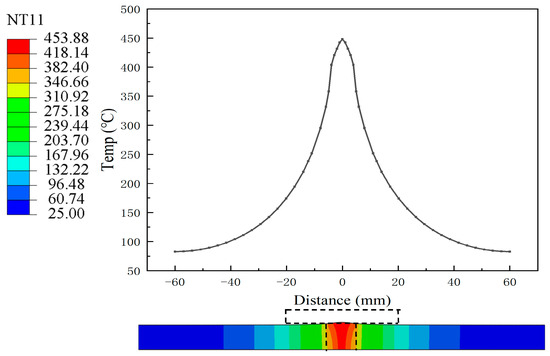 In order to analyze the spatial temperature distribution during welding, a cross-section at the very center of the welded plate was chosen. Under a welding speed of 100 mm/min and a rotation rate of 1300 r/min, Figure 9 depicts the temperature field at this section. The weld center experiences a temperature apex of approximately 450 °C, and the temperature progressively decreases on both sides, exhibiting a symmetrical pattern that is consistent with the trends reported in [16]. The primary cause of this behavior is the stable heat input that is the result of the symmetric motion of the heat source along the joint line, in conjunction with the intense friction generated by the stir tool in the central weld zone. The weld center is the first area to be directly affected by the heat source, and the accumulation of local frictional heat and plastic deformation heat is more pronounced. Consequently, the highest temperature zone is formed. The temperature rise rate and peak temperature of the material located further away from the heat source are comparatively lower due to the shortened heating duration. This results in a typical symmetric gradient temperature field.