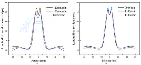 (a) Residual stress distribution at different welding speeds; (b) Residual stress distribution at different rotation speeds.