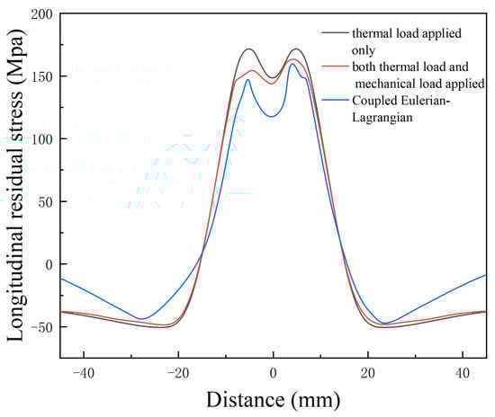 As shown in Figure 11, the peak longitudinal tensile stress is approximately 170 MPa when only thermal loading is considered. After introducing mechanical loading, the peak decreases to around 150 MPa. In the CEL model that accounts for material flow, the peak stress on the advancing side is around 160 MPa, slightly lower on the retreating side. A comparison between longitudinal residual stress results—obtained using only a moving heat source and those incorporating the tool’s axial pressure and shear force—shows that except in regions directly influenced by the tool, the differences remain minimal. Within the weld zone, tensile stress induced solely by thermal loading is notably higher than when both axial force and shear are considered. Furthermore, the CEL model yields stress magnitudes more consistent with those predicted under combined mechanical and thermal conditions. Additionally, a stress asymmetry is observed between the advancing and retreating sides, which is consistent with the results of He et al. [57] found consistent results.