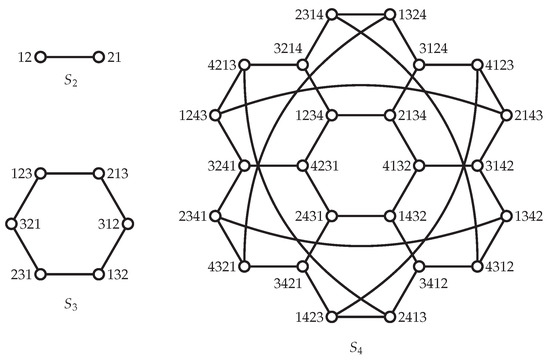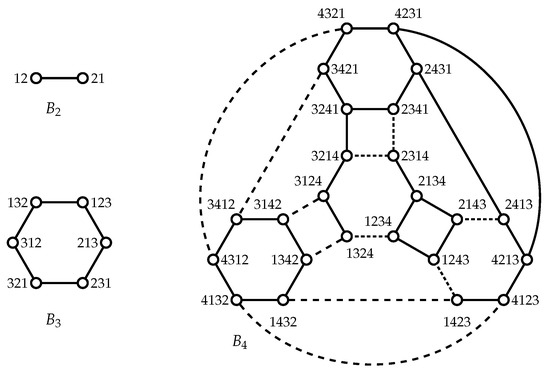 The n-dimensional bubble-sort graph was first introduced by Akers et al. [21]. It has high symmetry and a hierarchical structure [32]. In addition, is a Cayley graph , where is an n-path; thus, belongs to . In other words, an n-dimensional bubble-sort graph is a graph with vertices labeled with permutations on where two vertices are adjacent in if and only if there exists such that one vertex can be obtained from another by swapping the symbol of the i-th position and the -th position (see Figure 3). Many properties of have been explored, such as the h-connectivity [33], embedded connectivity [34,35], and conditional diagnosability [36].