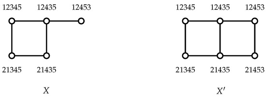 For , let X be the subgraph in induced by the five vertices, which have the first five positions with 12,345, 12,435, 21,435, 21,345, 12,453 and the last positions with . Note that , , and are the edges in . Let F be the edges between X and . Note that has no odd cycle, and there are no edges linking 21,345 and 12,453 since we cannot obtain the vertex 21,345 by swapping two symbols in the vertex 12,453. Thus, there are exactly five edges in X (see Figure 4). Therefore, . We can also obtain that has two components, and both of them contain at least five vertices. Hence, F is a 4-extra edge-cut in , that is, .