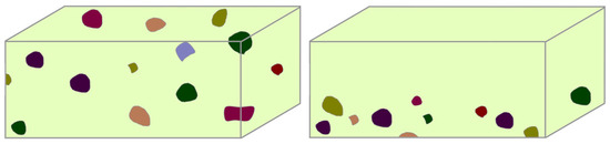 Let us consider the diffusion of an impurity in a multiphase randomly inhomogeneous body, which consists of solid phases that are different in density and have different diffusion coefficients, a matrix, and inclusions of arbitrary shape (Figure 1). At the same time, the precise spatial configuration of the phases within the body region is unknown. Then, the disposition of the inclusions is not known, but we assume that the law of their probability distribution is known [24]. Furthermore, suppose that the matrix volume fraction significantly exceeds that of the inclusion, (). The assumption is made that the material density and diffusion coefficient are constant in each of the phases.
