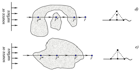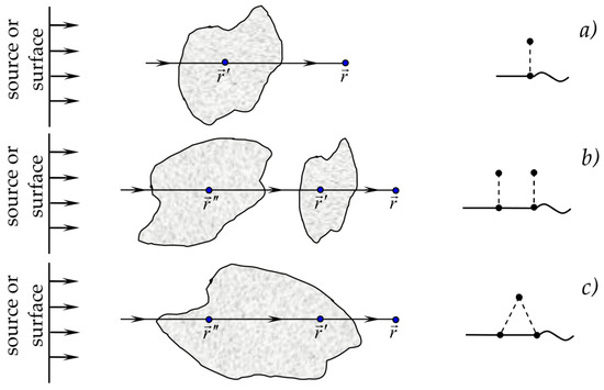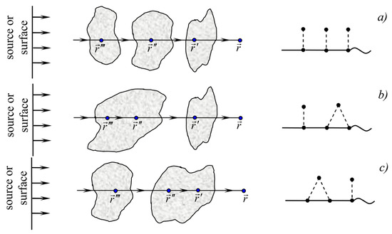 Let us consider the physical interpretation of Feynman diagrams. Diagram 1 from the series (37) describes the propagation of a concentration field from a source or from a surface (depending on the boundary conditions and the presence of internal mass sources) in a homogeneous medium. Diagram 2 describes the following process: the concentration field propagates from the source to point as in a homogeneous medium. At point , the concentration field is perturbed because this point belongs to the inclusion or its boundary ( belonging to the inclusion is determined by the averaged operator , otherwise it is zero). Then, the perturbed field reaches point , where the observation takes place (Figure 2a).