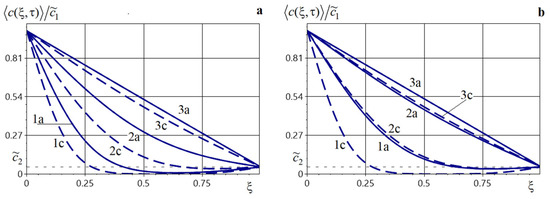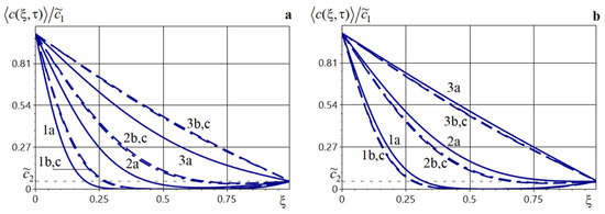 Figure 4 illustrates the distributions of concentration averaged over the ensemble of phase configurations (curves a, solid lines), concentrations in a layer with volume-averaged characteristics (curves b, dash-dotted lines), and concentrations in a homogeneous layer with matrix characteristics (c curves, dashed lines) at the moments of time (curves 1), (curves 2), and (curves 3). Here, Figure 4a is constructed for and Figure 4b for . The same applies to the figures a and b below unless stated otherwise.