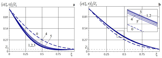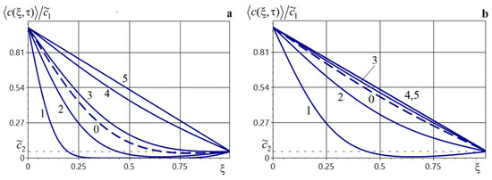 Figure 5 presents the graphs of the average particle concentration for different values of the kinetic coefficient in inclusions = 0.01, 0.5, 1.5, 5, and 20 (curves 1–5, respectively) for (Figure 5a) and (Figure 5b). Here, and further on, the dashed lines correspond to the impurity concentration in the body possessing the characteristics of the base phase.