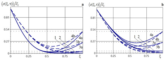 Illustrated in Figure 8 is the behavior of the averaged hydrogen-concentration field for (Figure 8a) and (Figure 8b) in the composite material . Curves 1–3 correspond to the dimensionless times , respectively.