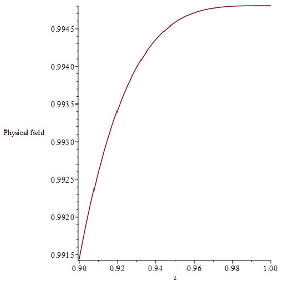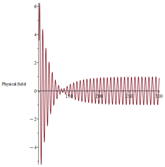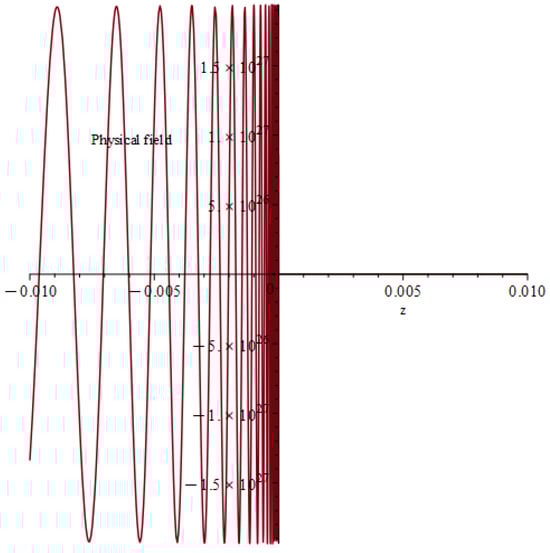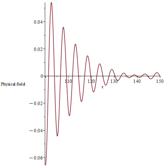 In Appendix C we offer a theoretical motivation for the ansatz given by Equation (42) and the explicit computation of and the first , coefficients. In order to visualize such a solution, we consider Equation (49) with the same choice for parameters given by Equation (40) (this time we do not have integration constants like and ), ending up with two plots: one for the real part (Figure 5) of the field and the other for the imaginary one (Figure 6). The relation with the local results by Persides in the massless case [3] is discussed in Appendix D.