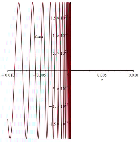 Plot of Im for , , setting and , up to the term. Unlike the real part, the phase shows a different behavior by virtue of its odd parity with respect to . The contributions to the integral on the r-axis seem to vanish in light of this feature.