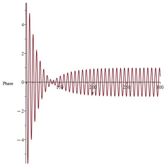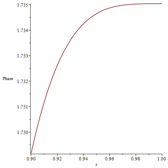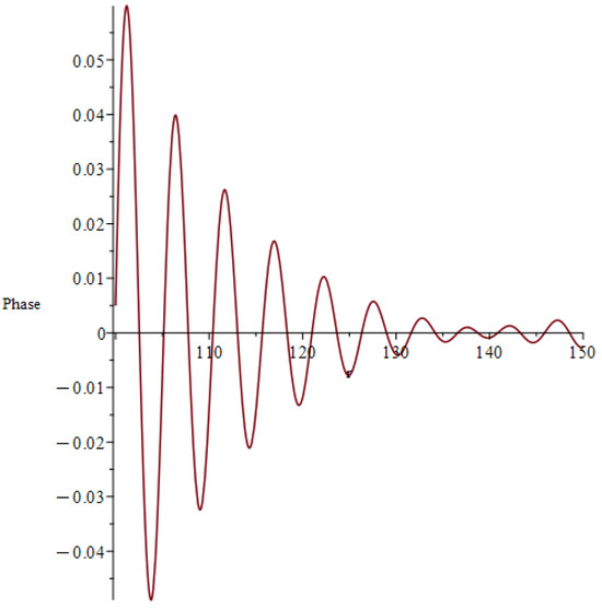 The imaginary part of Equation (38) is shown for . The phase shows qualitatively the same behavior as the real part but with slightly higher values.