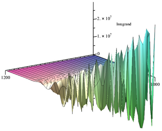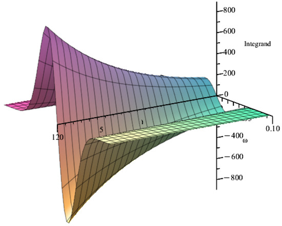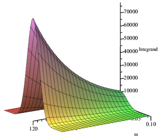 It is possible to evaluate numerically the integral given by Equation (53) by expanding around , since this region gives the largest contribution to it (as shown in Figure 7). We have performed such evaluation up to the sixth power of for the chosen parameters, arriving at the conclusion that such a piece diverges. In order to obtain also an analytical estimate of such a divergence, we consider the change of variable given by