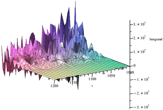 On both numerical and analytical grounds, we can say that, while the function diverges, the associated integral (given by Equation (52)) remains finite and eventually vanishes at spacelike infinity. In fact, we have an oscillating term alleviated by a series of negative powers of r.