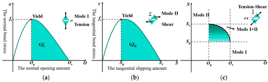 FDEM simulates the failure process of materials by simulating the fracture of quadrilateral joint elements. The failure modes can be divided into three categories: Figure 1a for tensile failure, Figure 1b for shear failure, and Figure 1c for tension–shear composite failure. Figure 1 shows the destruction mode of the material and the energy required.