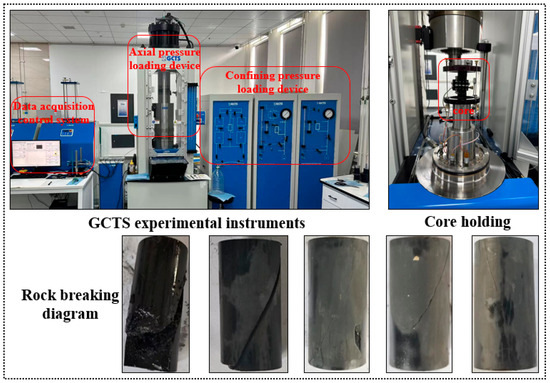 To study the mechanical properties of shale in the G area of the Songliao Basin, shale samples from this region were selected and prepared into standard cylindrical specimens of 25 mm × 50 mm in the laboratory. Five specimens were prepared for repeat experiments. Conventional triaxial compression tests were conducted on the shale specimens using the GCTS RTR-2000 mechanical testing system, which is manufactured in Tempe, AZ, USA. The experiments employed a displacement-controlled loading method with a loading rate of 0.5 mm/min. After applying a confining pressure up to 30 MPa, the confining pressure was kept constant while the axial pressure was gradually increased until the specimen became unstable and failed. This approach enabled the acquisition of deformation and fracture characteristics of deep shale and the true load–displacement curves. Figure 2 shows a schematic diagram of the experimental apparatus and images of rock fractures, indicating that the rock fractures mainly exhibited oblique splitting. Table 2 lists the basic mechanical parameters of the five rock samples.