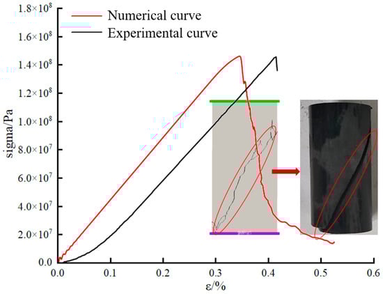 Before conducting triaxial compression simulations using FDEM, it is necessary to calibrate the computational parameters. Previous studies have indicated that numerical simulation results can be compared with laboratory triaxial compression results for parameter calibration. When the failure modes, strength values, elastic moduli, Poisson’s ratios, and stress–strain curves obtained from simulations closely align with laboratory test results, or when the deviations are within an acceptable range, the input parameters used in the simulation are deemed reasonable. This alignment ensures that the simulation accurately represents the physical behavior of the material under study, validating the robustness and reliability of the chosen parameters. This implies that the final parameter calibration results are not unique and that the relevant parameters can be adjusted within a range where the simulation results can still closely match the laboratory results.