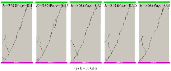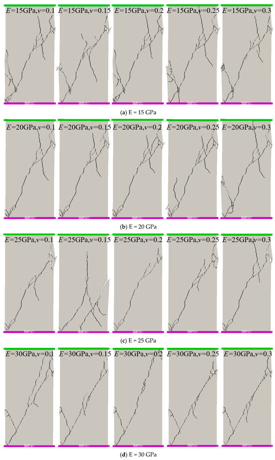When the elastic modulus is low, such as E = 15 GPa and 20 GPa, there is no significant change in crack behavior with varying Poisson’s ratios. However, when the Poisson’s ratio increases to 0.3, the number of crack branches decreases at E = 15 GPa, while new crack branches appear at E = 20 GPa. Furthermore, when the elastic modulus reaches a certain level, such as E = 25 GPa and 30 GPa, the influence of Poisson’s ratio on crack morphology becomes evident. Cracks formed under low Poisson’s ratios exhibit greater complexity compared to those formed under high Poisson’s ratios. As the elastic modulus continues to increase to 35 GPa, the influence of Poisson’s ratio on crack morphology diminishes.