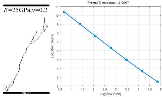 These results suggest that, with a constant Poisson’s ratio, an increase in elastic modulus enhances the resistance to external forces and reduces the extent of elastic deformation, leading to a gradual decrease in crack branching and complexity. At both low and high elastic moduli, the influence of Poisson’s ratio on crack complexity is relatively small. However, at moderate elastic moduli, such as E = 25 GPa and 30 GPa, Poisson’s ratio begins to significantly affect crack morphology, with cracks formed under low Poisson’s ratios exhibiting greater complexity compared to those formed under high Poisson’s ratios.