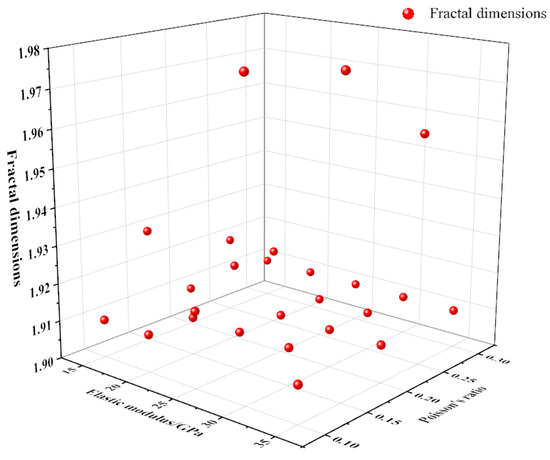 Scatter distribution of fractal dimensions under different elastic moduli and Poisson’s ratios.