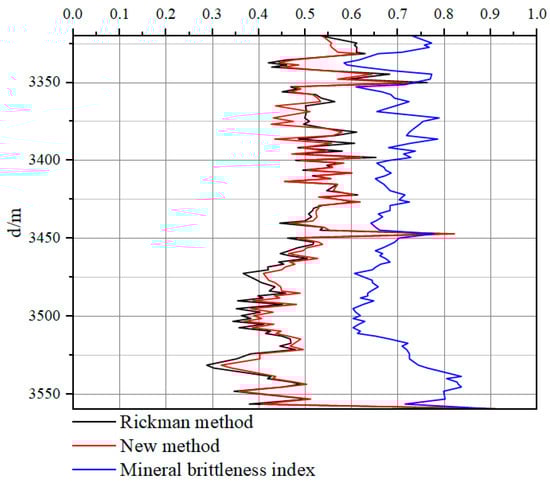 Using the mineral content distribution curves in Zone M, the brittleness index of minerals was calculated using Equation (11), and the brittleness index of Rickman was computed using the measured Young’s modulus and Poisson’s ratio data with Equations (12)–(14). Additionally, the brittleness index of the new method was obtained using Equations (12), (13), and (15). Figure 7 depicts the intersection results of the brittleness index of minerals and the two brittleness evaluation methods. Generally, there is a certain positive correlation between the brittleness mineral curve and the brittleness index. The trend of the new brittleness evaluation index is roughly consistent with Rickman’s brittleness evaluation method.
