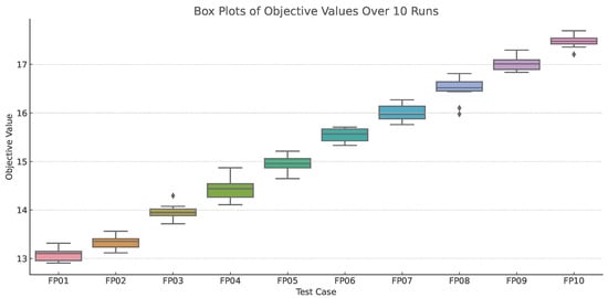 Figure 7. Box plots of objective values over 10 independent runs for selected test cases are provided to assess solution stability and variation. The visual results demonstrate both the consistency and efficiency of Loegised across different problem scales.