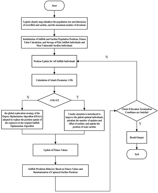 The flowchart of the Osprey and Cauchy Mutation integrated sailfish optimization algorithm is shown in Figure 1. In view of the flaws of the original Sailfish Optimization Algorithm (SFO), such as low convergence precision and a propensity to get stuck in local optima, this paper puts forward an Osprey and Cauchy Mutation Integrated Sailfish Optimization Algorithm (OCSFO). The enhancements are mainly carried out in three aspects: (1) Using the Logistic map to initialize the sailfish and sardine populations. (2) In the first stage of the local development phase of sailfish individual position update, adopting the global exploration strategy of the Osprey Optimization Algorithm to boost the algorithm’s global search capability. (3) Introducing Cauchy mutation to activate the sailfish and sardine populations during the prey capture stage.