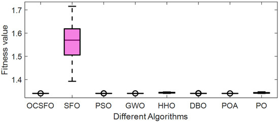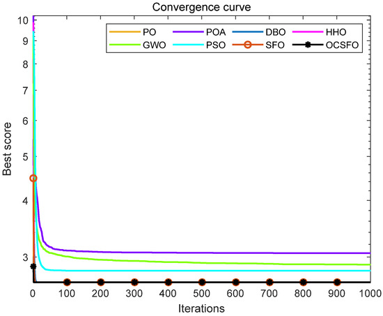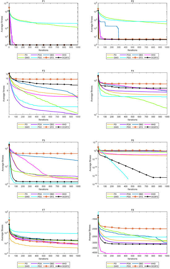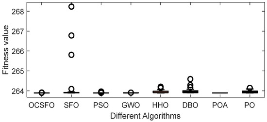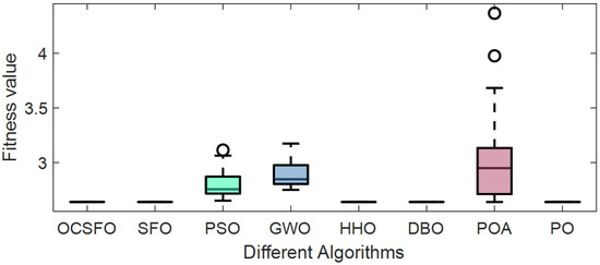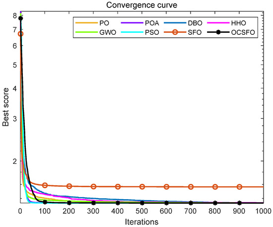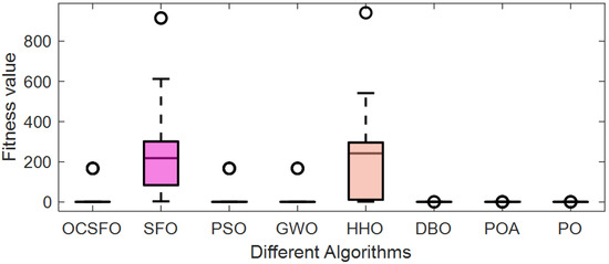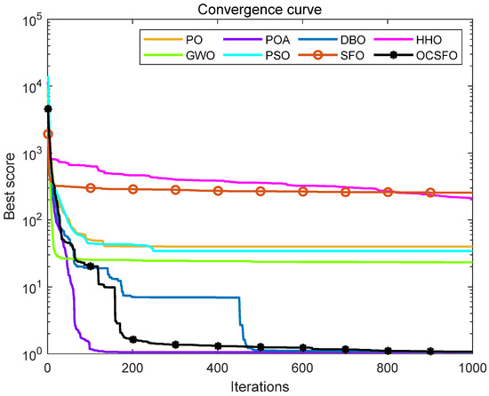 In the experiments to verify the performance of the OCSFO algorithm, the experimental environment is set up as follows: The operating system is Windows 10 (64-bit), the processor is Intel(R) Core(TM) i7-10875H with a main frequency of 2.3 GHz, the computer memory is 16 GB, and the simulation software is MATLAB R2020b. To verify the effectiveness and advantages of the OCSFO algorithm, the OCSFO algorithm is compared with the standard SFO algorithm and six other well-known intelligent algorithms: PSO [40], GWO [41], HHO [42], DBO [43], POA [44], and PO [45]. To ensure the fairness of the algorithm comparison, the population size of all algorithms is set to 50, the number of iterations is set to 1000, and the dimension is set to 30. The fitness values obtained from 30 independent runs of each algorithm, including the optimal value (Min), standard deviation (Std), average value (Avg), median value (Median), and worst value (Worse), are used as evaluation indicators. The optimal data in the statistical results are shown in bold.