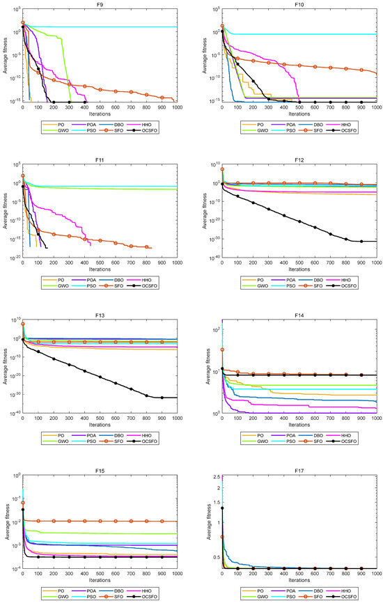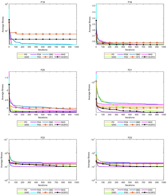 Notably, OCSFO excels in multimodal function optimization. In F9, F10, F11, F12, and F13—characterized by complex, multi-peak structures—it not only converges to the theoretical optimal values but also does so with significantly faster convergence kinetics compared to other algorithms. This proficiency underscores its enhanced ability to navigate rugged fitness landscapes and avoid premature stagnation in local optima. Further validation is observed in fixed-dimension multimodal functions (F15, F17, F19, F20, F21, F22, F23), where OCSFO consistently exhibits stronger global search capabilities. Function F16 encountered an error and did not display the image, it is not be displayed. Its performance across these diverse problem classes demonstrates remarkable adaptability to highly non-linear, multi-peak search spaces, a critical advantage for real-world engineering applications.