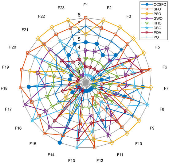 Comparison of 23 classical function radar charts for 8 algorithms is shown in Figure 3.