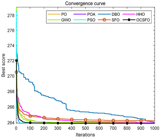 It can be seen from Table 5, Figure 8 and Figure 9 that compared with the other seven algorithms, OCSFO can find a result close to the minimum optimization of the three-bar truss design problem. The optimal value obtained by OCSFO for the piston rod problem is 263.8958, and the optimal solution is s = [0.7887, 0.4082].