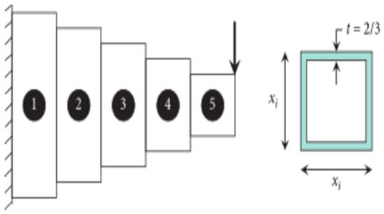 The cantilever beam problem is a structural engineering design example involving the weight optimization of a rectangular-cross-section cantilever beam. One end of the beam is rigidly supported, and the free node of the cantilever is subjected to a vertical force, as shown in Figure 10. The beam consists of 5 hollow squares with a constant thickness. The height (or width) of the square is the decision variable, and the thickness remains fixed [48].