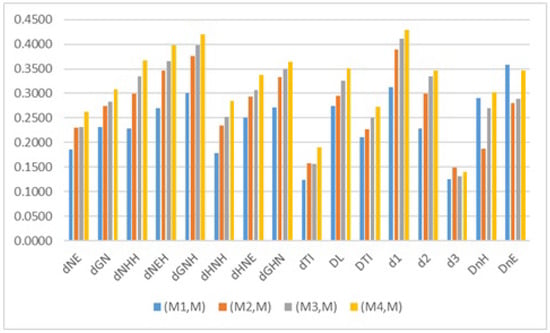 To address this limitation, Thakur and Jafari [] introduced the (m,a,n)-FNSs framework, which enables distinct powers to be assigned to the PMD, IMD, and NMD, offering greater modeling flexibility in uncertain and imprecise environments. One of the main objectives of this research is to explore this newly proposed class—(m,a,n)-FNSs—to formulate a comprehensive family of distance measures. These measures provide a more expressive representation of the PMD, IMD, and NMD compared to conventional q-RONS-based models. The flexibility of choosing different powers allows a more context-sensitive assessment of input data by assigning varying significance to the PMD, IMD, and NMD—an important requirement in multi-criteria decision-making (MCDM) problems. Unlike other generalizations of IFSs in a neutrosophic framework such as PyNSs (where power = 2), FNSs (power = 3), and q-RONSs (power = q), which enforce fixed exponents, the (m,a,n)-FNS model accommodates variable exponentiation for each component. This power function-based flexibility extends the applicability of neutrosophic systems to a broader range of decision-making scenarios. As a result, (m,a,n)-FNSs offer a more inclusive modeling structure, capturing uncertainty more effectively than traditional q-RONSs. In particular, (m,a,n)-FNSs, which utilize triple universes, prove to be more adaptive and accurate than their single-exponent counterparts like m-RONSs, a-RONSs, and n-RONSs when assessing distances among multiple objects. In summary, (m,a,n)-FNSs represent a generalization that not only encompasses q-RONS-based methods as special cases but also provides enhanced capabilities for addressing complex MCDM problems.