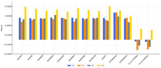 The rankings of the alternatives according to the proposed and compared MCDM methods are presented in Table 19. Furthermore, the ranking outcomes are depicted graphically in Figure 2 for visual comparison. Considering all the methods under comparison, the optimum alternative is identified as . The consistency in rankings across the different methods, along with the agreement on the top-ranked alternative, demonstrates the robustness and reliability of the proposed method.