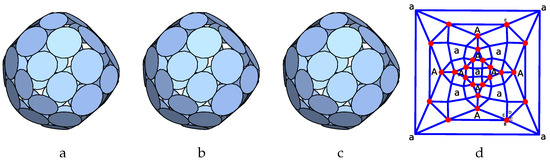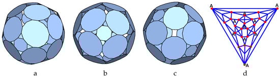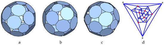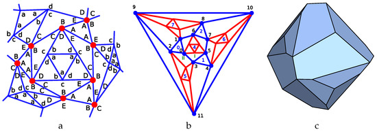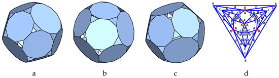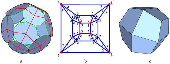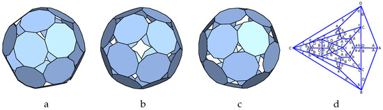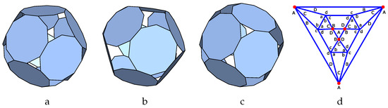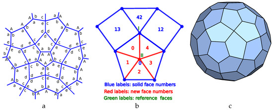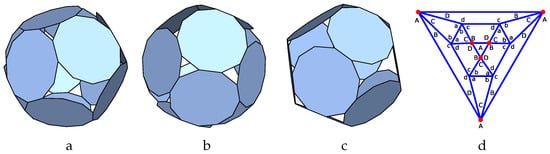 The reference face of type I is mapped onto the other two faces of the same type added on face 4 of the truncated tetrahedron via a rotation around the centre of that face. The other faces of type I are mapped from these three faces via the symmetry mapping of the hexagonal faces of the truncated tetrahedron. The resulting tilling solid is presented in Figure 7c. This is an example where the tilling solid is not easy to obtain due to its somewhat irregular and twisted nature. Once it was obtained, the normal of its reference faces were used as initial normal vectors for the p-cage faces to generate the 10,206 different p-cages.