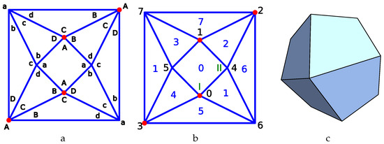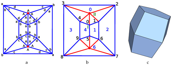 Figure 5b describes the parametrisation used to build the tilling solid. is chosen as vertex 0 of the prism while is chosen as the centre of face 0. Vertices 1–9 of the solid are related via the symmetries of the pyramid, and they translate into the symmetry between the p-cage faces belonging to the first family. The two faces of the second family are related via the same symmetry as the one transforming face 0 and 6 of the prism.