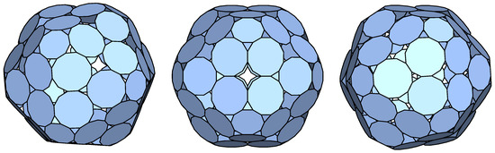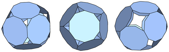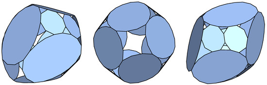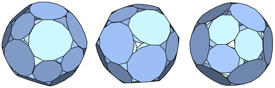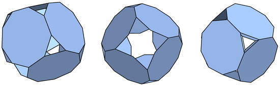 The discovery of these new geometries leads to the definition of Polyhedral cages, (p-cage) [36,37], as an assembly of regular or nearly regular polygons such that each face shares at least three of its edges with other faces and also such that, of the two adjacent edges, at most one of them can be shared with another face. As some of the face edges are not shared, the p-cage does have holes that can have any shape, unlike the faces that must be planar convex polygons. A p-cage is convex if all the dihedral angles between adjacent faces are less than .